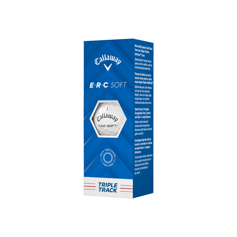 Callaway ERC Softissa yhdistyvät Hybrid Cover -kuori ja Hyper Elastic SoftFast Core, jotka takaavat pitkän lentokaareen, hallittavan spinnin ja miellyttävän lyöntituntuman. Triple Track -kohdistusviivat auttavat parantamaan tarkkuutta viheriöllä, mikä tekee siitä suositun valinnan niin ammattilaisille kuin harrastajille.